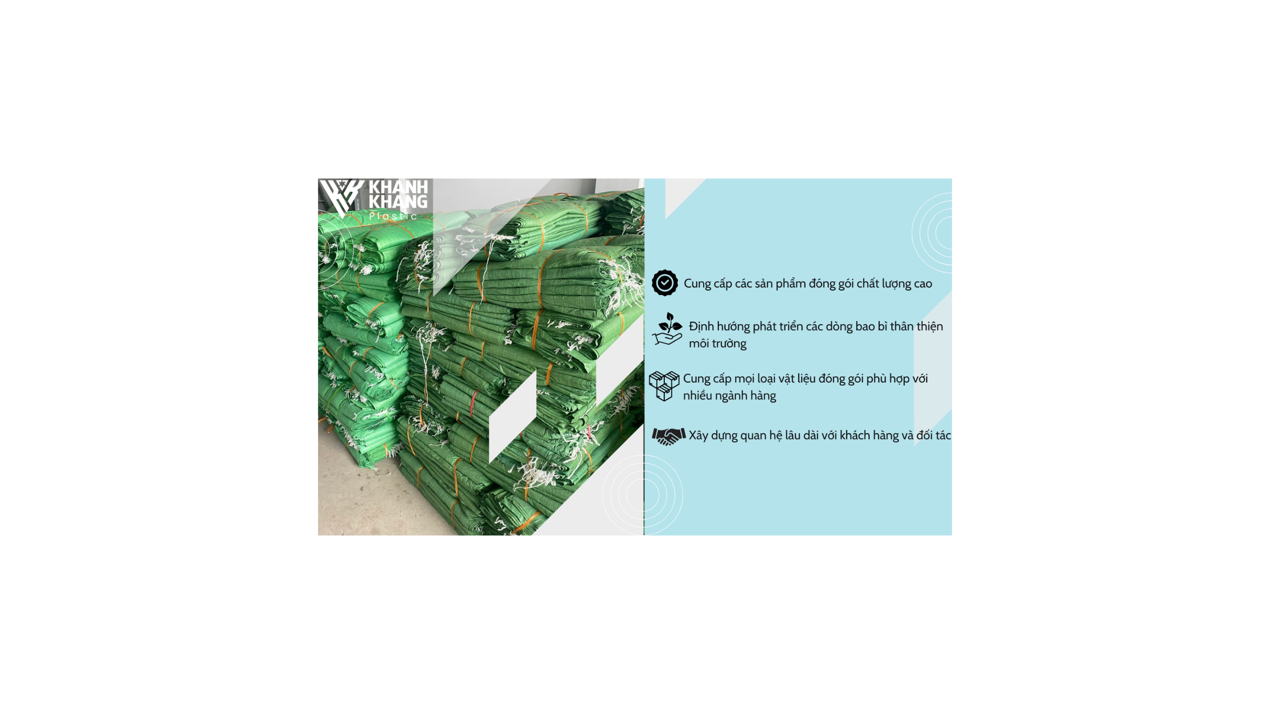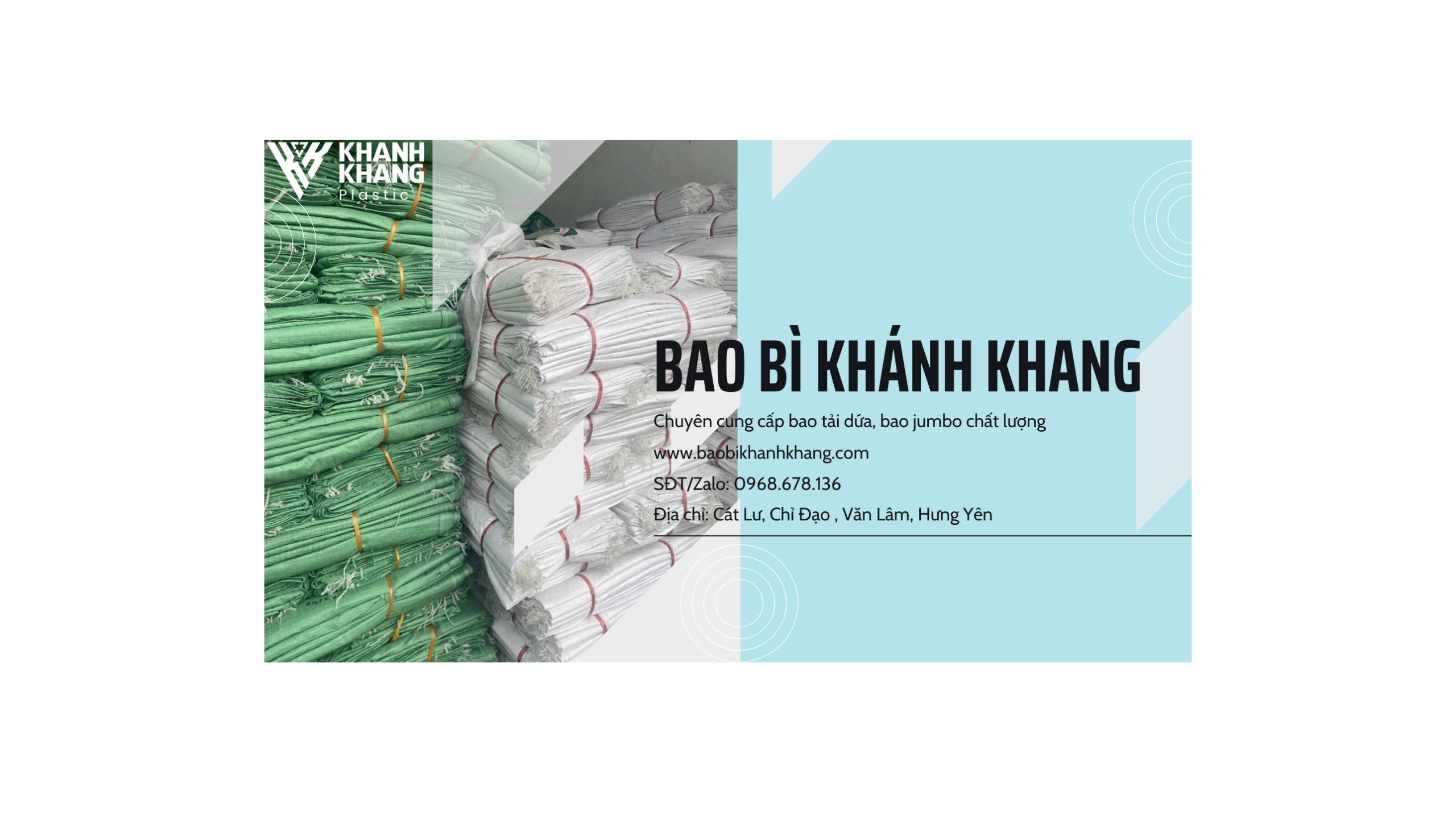 Công ty CP Bao Bì Khánh Khang chuyên sản xuất và phân phối các sản phẩm bao bì dứa, bao tải jumbo, bao bì PP... Sản phẩm của công ty Khánh Khang chúng tôi, với nhiều quy cách và chủng loại khác nhau được tạo từ các hóa chất không độc hại, tỉ lệ co dãn cao, đủ điều kiện để khách hàng đóng gói và xuất đi nước ngoài...